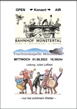 Liebe Freunde der Blasmusik, wir freuen uns, dass wir für euch unter der Leitung von Julien Laffaire wieder am Bahnhof Münstertal spielen dürfen.